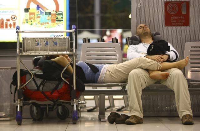 European tourists sleep at Suvarnabhumi airpor, Bangkok in the early hours of