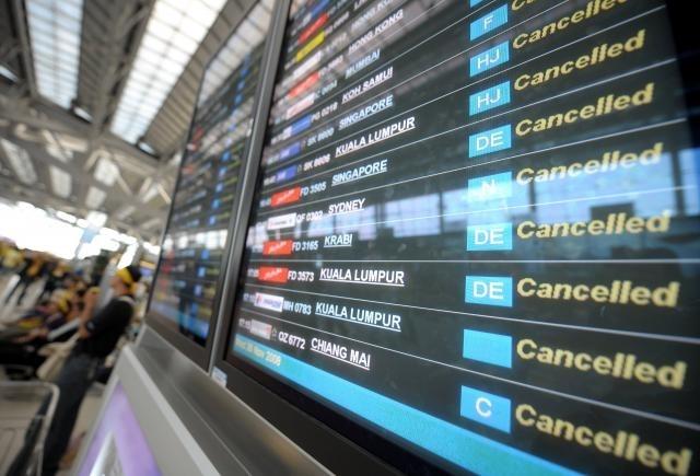 A departure display showing cancelled flights is seen after anti-government